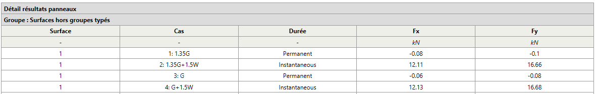 Les vérifications ELU et ELS des surfaces CLT sont réalisées. Ces dernières sont conduites conformément à la norme « CEN/TC 250/SC 5: Structural Eurocodes -- Timber Structures -- SC5.PT1 'CLT' (2016), Working draft of design of CLT in a revised Eurocode 5-1-1: Version 2017_10_13 ». Le bouton d'information permet l'obtention des résultats pour un nœud donné ou pour l'ensemble d'une surface. Dans ce dernier cas, sont donnés pour chaque critère considéré les résultats les plus pénalisants pour la surface.