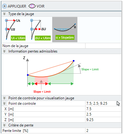 On note ici que ce critère deviendra ainsi supérieur à 100% dés que la pente en un point de l’une des pièces considérées dans la jauge sera inférieure à la pente limite définie.