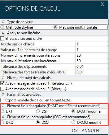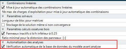 Il a été constaté que certains modèles présentant des instabilités pouvaient être corrigés par une vérification et réparation de la base de données. Pour éviter des échecs de calcul inutiles, un nouvel automatisme a été mis en place. Désormais, avant de lancer une analyse, le logiciel effectue une vérification silencieuse de l'intégrité du modèle. Cette vérification inclut la détection de pièces superposées, de structures discontinues et d'autres erreurs potentielles de la base de données.